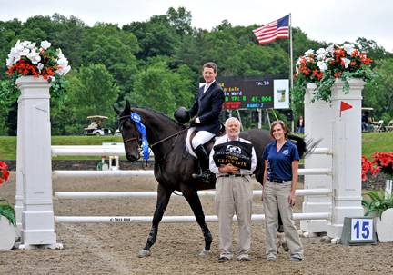 | © ESI Photography. HITS' Tony Hitchcock and Christine Pankratz presented the first-place ribbon and awards to McLain Ward and Oh' D Eole. |